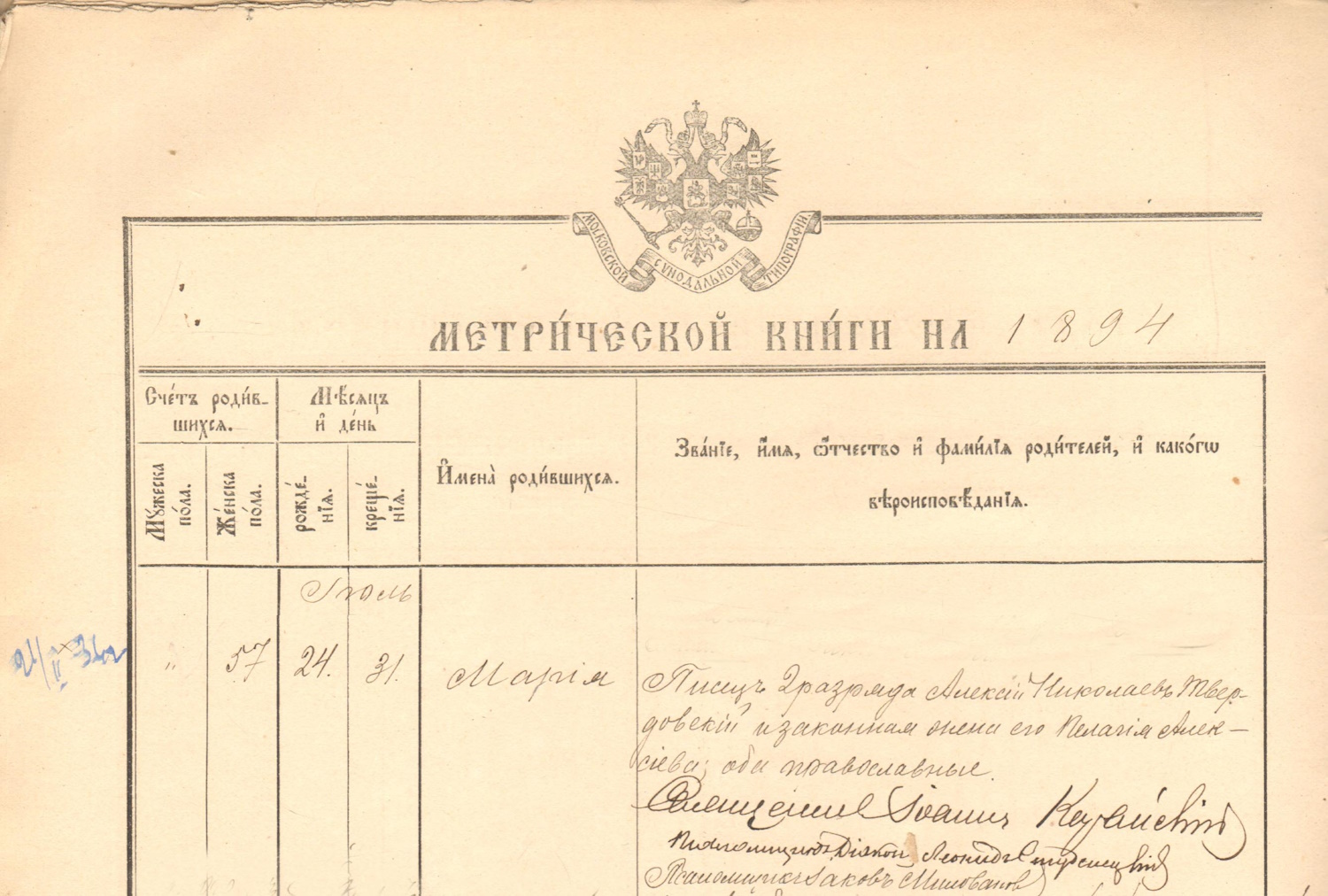 Актовая запись о рождении Твердовской Марии Алексеевны