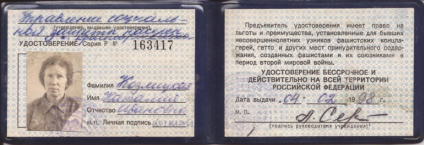 Архивная справка Козлицкой Н.И. и Удостоверение узника