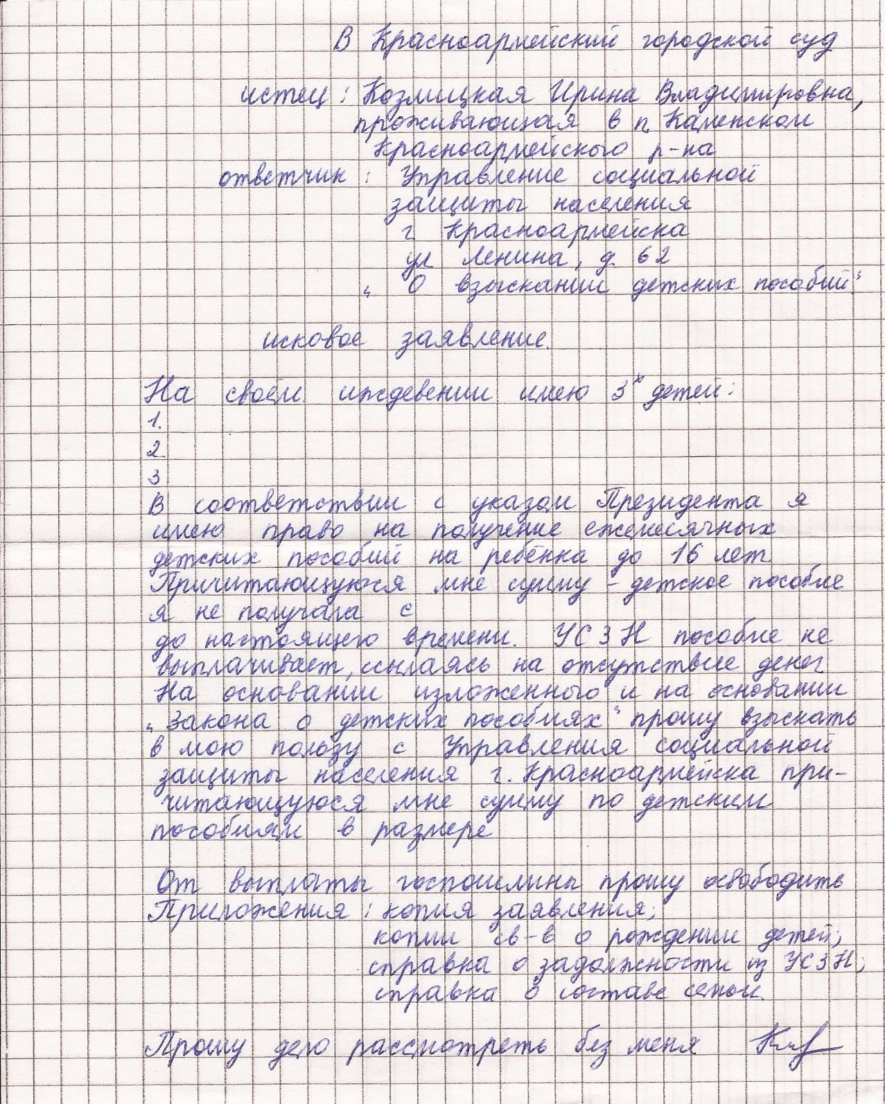 Исковое заявление Козлицкой И.В. в Красноармейский городской суд
