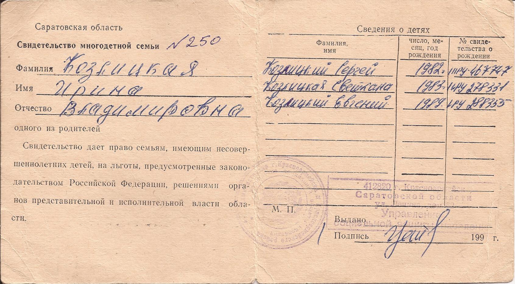 Свидетельство многодетной семьи Козлицких