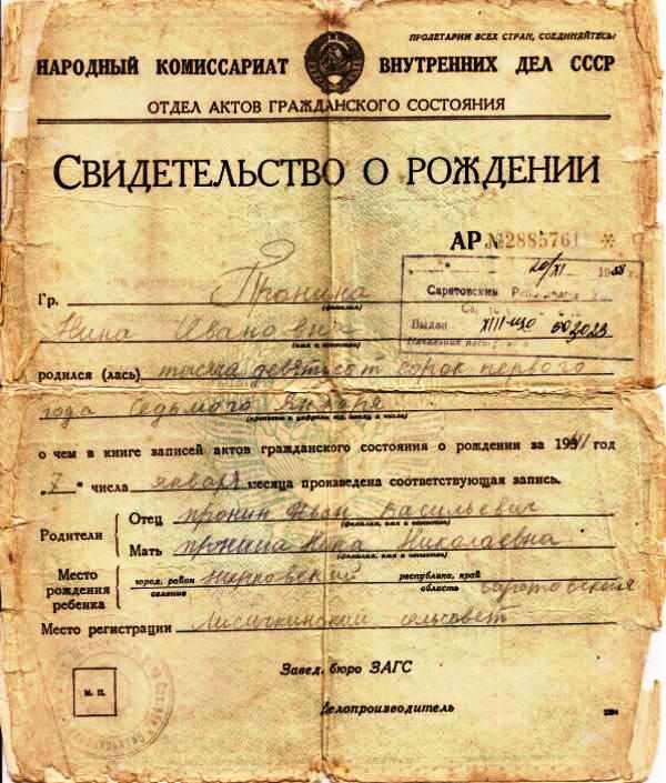 Профсоюзный билет Прониной (Редихиной) Нины Ивановны
