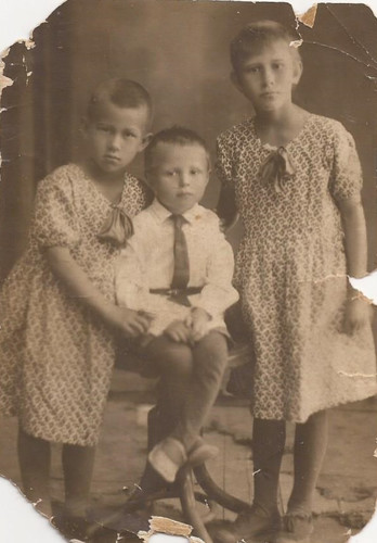 Девочки - это точно племянницы деда, Пронина Ивана Васильевича, дочери его сестры Екатерины Прониной-Гусевой. Справа - Люда, слева - Валя. Мальчик может быть сыном другой сестры деда, Анастасии. Если я не ошибаюсь, его зовут Юрий.